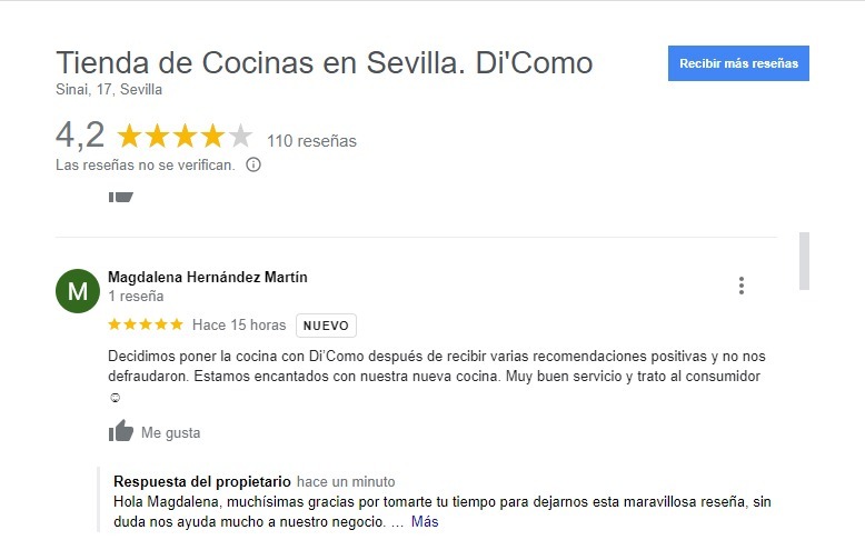 BUENO A base de 108 reseñas Esther Fr2023-09-13Trustindex verifica que la fuente original de la reseña sea Google. Tengo la cocina que quería. Así de simple. Os comento cómo se consigue: - Vas a Dicomo y comentas que quieres una cocina. - Te atiende un profesional en diseñar tu cocina ideal (en nuestro caso, Conce). Te explica calidades, materiales, terminaciones y TE ESCUCHA para saber cuáles son tus necesidades reales. Partiendo del plano básico que llevas, comienza a trabajar y te presenta varias opciones que dan respuesta a lo que has pedido y vais conjuntamente construyendo el modelo de cocina que quieres: muebles, encimera, grifería, electrodomésticos, …, todo! A partir de ese momento, es siempre tu referencia para atenderte personalmente y eso se nota! - Cuando ya tenéis el modelo final, acude el medidor a casa. Otro fuera de serie. Solo puedo decir que mi cocina encajó simplemente a la perfección cuando se instaló. - Encargas la cocina y fijas cuándo va a llegar a casa. Y ese día está allí. Con el equipo de montaje. Experiencia en estado puro: hábiles, rápidos y limpios (y muy agradables en el trato, dicho sea de paso). El boca a boca nos trajo aquí. Que siga! Victoria Sanabria Rozalem2023-09-12Trustindex verifica que la fuente original de la reseña sea Google. Hace un año que disfruto de mi COCINA DICOMO y la experiencia es magnífica. Ningún problema, todo funciona a la perfección y ante cualquier duda siempre están dispuestos a solucionar. Son unos auténticos profesionales. MI COCINA ES ESPECTACULAR. gabriella caldaronello2023-09-11Trustindex verifica que la fuente original de la reseña sea Google. Desde el minuto uno, supe que era la tienda perfecta para encontrar lo que quería..Me atendió Carlos y en cada momento supo asesorarme, aconsejarme y ayudarme para que el sueño de tener una cocina como la quería se hiciera realidad!Los vendedores, en mi caso Carlos, los instaladores y todo el personal son un 10!Atentos, cuidadosos y super profesionales!!!El dinero mejor invertido de mi vida! Todo perfecto, todo genial!!!!!Satisfecha 100% Bartolome Carlos García Gómez2023-08-18Trustindex verifica que la fuente original de la reseña sea Google. Nos pusimos en contacto con ellos para montar una cocina, en casa de mis padres. Desde el primer momento, nos atendieron muy bien y fueron muy profesionales. Una vez aceptado el presupuesto y elegida la cocina. Todo fue en el plazo marcado. Medidores, montadores, etc. muchas gracias a Joaquin por el trato hacías mis padres y a todo el equipo. Borja Martin Prieto2023-05-15Trustindex verifica que la fuente original de la reseña sea Google. Excelente servicio y calidad. Formalidad y compromiso con el cliente. Un placer que nos montaran la cocina. Sara LG2023-02-12Trustindex verifica que la fuente original de la reseña sea Google. Hemos contratado con Di'Como la cocina y el lavadero y estamos plenamente satisfechos con el trabajo realizado. Unos grandes profesionales los montadores, el medidor y especialmente Carlos que nos ha orientado y ejecutado nuestro proyecto con gran acierto. Una cocina espectacular y de gran calidad. Absolutamente recomendable. Muchas gracias a todo el equipo Di'Como Tio Mad El Viajero2023-02-12Trustindex verifica que la fuente original de la reseña sea Google. Muy contentos con el resultado y el trabajo de todo el equipo...muy profesionales y de confianza...Sara y José... gracias! Jose BP2022-10-04Trustindex verifica que la fuente original de la reseña sea Google. Muy buen servicio y competencia del personal. Un trato muy amable. Optirent Ibérica2022-08-21Trustindex verifica que la fuente original de la reseña sea Google. Cocina espectacular ! Quedo todo impecable , el señor Carlos nos ayudo a terminar de diseñar la cocina con su experiencia todo es mucho más fácil , es la 3 cocina que me hacen y volvería a repetir . Felicidades a todo el equipo . rosa orellana bordallo2022-08-17Trustindex verifica que la fuente original de la reseña sea Google. Muchas gracias a los profesionales de Di'Como cocinas, empezando por Juan Carlos y Conce que nos atendieron de maravilla, y los montadores Óscar y Antonio, solucionando problemas, estamos muy contentos con el resultado, totalmente recomendable, y por supuesto con mucha calidad en los muebles